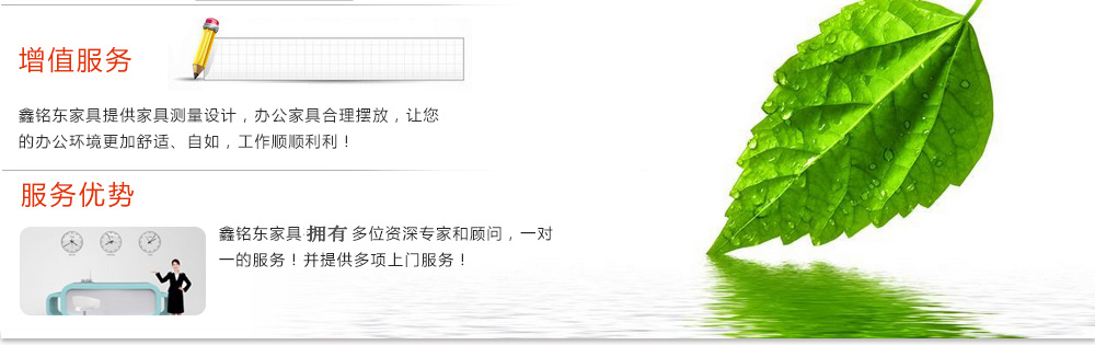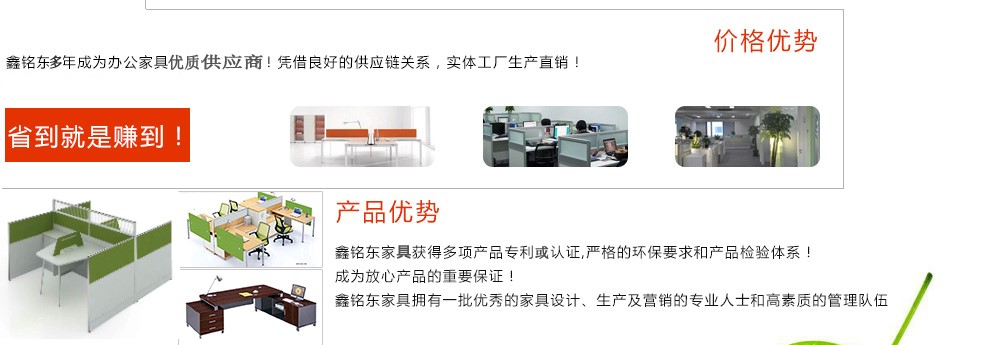 深圳市鑫銘東家具有限公司專(zhuān)業(yè)銷(xiāo)售各類(lèi)辦公家具!產(chǎn)品涉及多種系列,如:班臺(tái)、班椅、屏風(fēng)、會(huì)議桌、會(huì)議椅、辦公沙發(fā)、茶幾、辦公桌、文件柜、電腦桌椅、各式餐臺(tái)、餐椅、書(shū)柜等辦公家具。 鑫銘東家具擁有一批優(yōu)秀的家具設(shè)計(jì)、生產(chǎn)及營(yíng)銷(xiāo)的專(zhuān)業(yè)人士和高素質(zhì)的管理隊(duì)伍。銘東家具以"先難后易"之戰(zhàn)略,在產(chǎn)品結(jié)構(gòu)、產(chǎn)品質(zhì)量及服務(wù)水平方面,均推陳出新,力求完善,精益求精。使我們的產(chǎn)品質(zhì)量保持在國(guó)內(nèi)外家具潮流的先進(jìn)水平,力求滿足客戶的特殊需求。鑫銘東家具多年來(lái)致力于環(huán)保、實(shí)用家具的設(shè)計(jì)與開(kāi)發(fā),集生產(chǎn)、銷(xiāo)售、服務(wù)于一體。本著"以人為本"的設(shè)計(jì)理念,大量開(kāi)發(fā)符合人體工程學(xué)的各種產(chǎn)品,以"誠(chéng)信為本"的質(zhì)量方針,真材實(shí)料,認(rèn)認(rèn)真真做產(chǎn)品,實(shí)實(shí)在在做人。鑫銘東家具更致力于創(chuàng)造"零維修率"的制造境界,實(shí)現(xiàn)"沒(méi)有維修的服務(wù)才是最好服務(wù)"的口號(hào)》了解更多